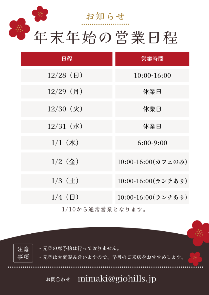 2025.12.25 年末年始の営業日 今年は28日まで営業いたします。元旦は例年通り、朝6時からオープンしますので、2026年の初日の出はジオヒルズからいかがでしょうか。 ジオヒルズ各SNS Facebook Instagram YouTube ワイン文化を未来へ繋ぐ会 SNS Facebook Instagram Prev 一覧に戻る